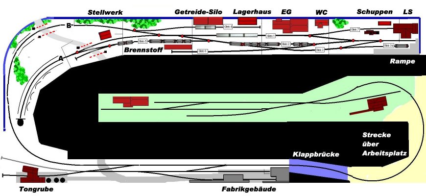 In Spur 0 ist eine Raum von 8,40 Meter Länge und 3,40 Metern Breite nicht besonders groß. Als Maximum können Radien von 1,40 Metern eingeplant werden. Damit scheidet die Darstellung einer Hauptbahn von vorneherein aus.