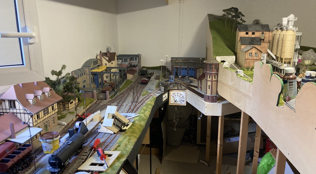 Der Geländebau wurde begonnen. Grünzeug, und da vor allem Büsche und Bäume zwischen Fabrik und Lokschuppen, fehlen noch.