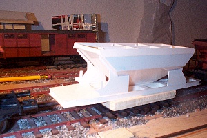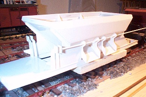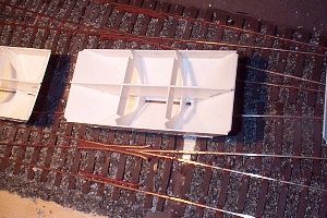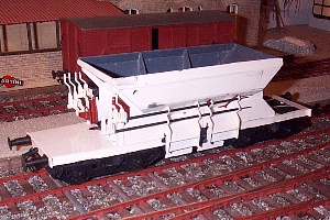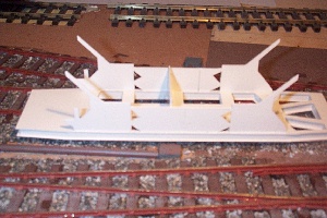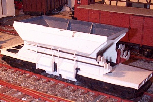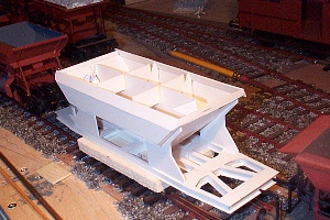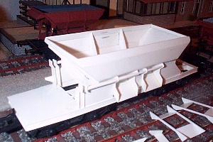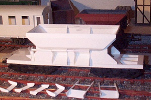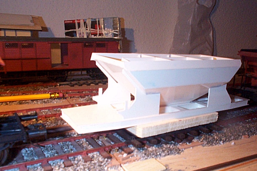 Mann sieht es kaum, aber ich habe ein neues Fahrwerk gebaut (ca. 2 cm länger). Vorbild ist jetzt ein Nachkriegswagentyp mit Vorbildachsstand der Drehgestelle von 2.0Meter (Wie die Rivarossi-Drehgestelle). Das Fahrwerk für den bisherigen Wagen war für Drehgestelle mit 1,8 Meter Achsstand gebaut. (Wird aber weitergebaut, wenn ich genügend Drehgestelle habe um aus zwei von ihnen auch 1,8-Meter-Varianten zu schnitzen.