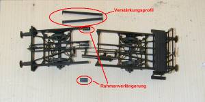 Um die Stabilität zu erhöhen, wurde an der Verbindungsstelle zwischen den beiden Fahrwerkshälften und der Rahmenverlängerung ein Verstärkungsprofil eingeklebt.
