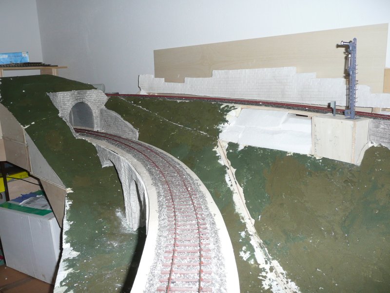 Das Ganze erhält anschließend einen ersten Überzug aus Sandspachtel. Das "Rezept" dafür habe ich auf der Fremo-Homepage gefunden. Irgendwie habe ich mich bei den Zutaten vertan und das ganze wird etwas zu sehr Grün-Oliv. Aber als Basis zum Begrünen sicher ausreichend.