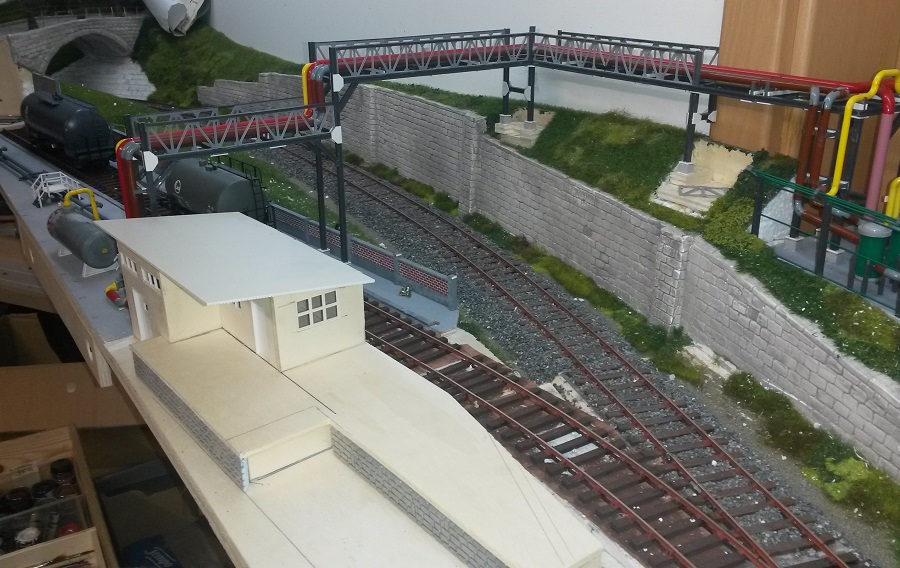 Zunächst habe ich an der Endladestelle für die Kesselwagen weitergebaut. Nach hinten wird die Fläche durch eine kleine Mauer abgeschlossen.Im Vordergrund liegen paralell zum Gleis 2 Leitungen an die die ankommenden Kesselwagen mit Schläuchen angeschlossen werden sollen (nur imaginär). Einige Überstiege helfen den Betreibern beim queren der Rohrtrasse. Die Entleer-Leitungen führen in ein Pumpenhaus mit kleinem Büro und angeschlossener Laderampe für Betriebsmittel.