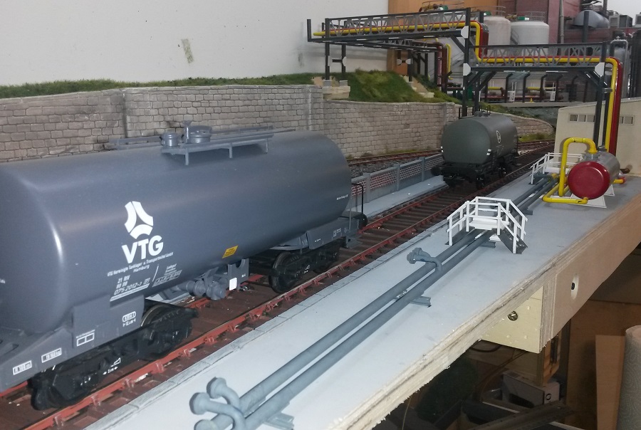 Damit ist der "Rohbau" für die Kesselwagen-Entladung abgeschlossen. Noch sind die meisten Rohreitungen bunt und es fehlt noch an allen Ecken die endgültige Farbe und eine Alterung.