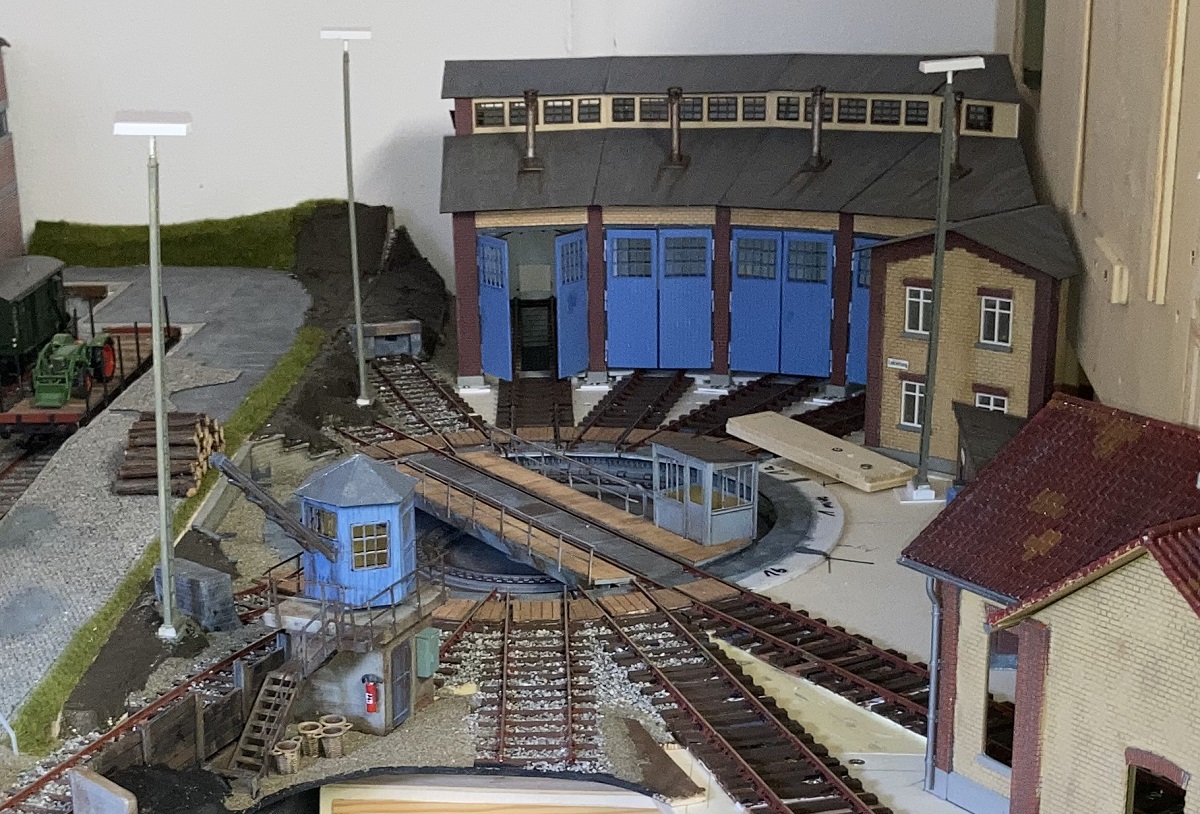Die Drehscheibe wurde fertiggebaut (Bühnenbelag aus Holz, Geländer, Häuschen und eine dezente Alterung)