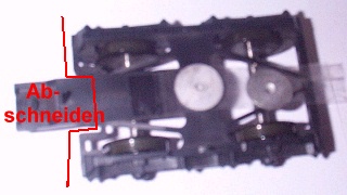 Um die Rivarossi-Drehgestelle unter den Wagen zu kriegen müssen die Befestigungen für die Kupplung abgeschnitten werden,